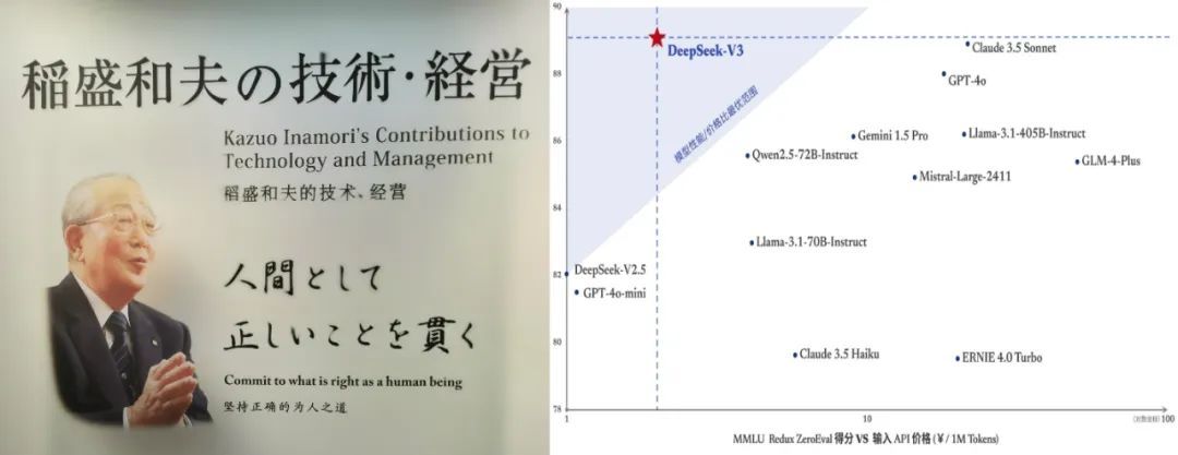 其次,追求极致的“匠人精神”。DeepSeek在技术研发中所体现的“穷鬼训练法”(如FP8精度训练)以及高效模型设计(如V3模型推理成本仅为GPT-4的5%),展现了稻盛所倡导的“付出不亚于任何人的努力”的极致追求。这种在资源受限情况下实现突破的能力,与稻盛“在旋涡中心工作”的哲学相互呼应——通过专注与深耕来实现技术突围。